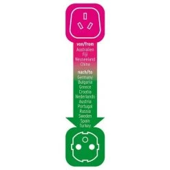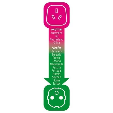Adapter enabling electrical equipment using the Australian or Chinese socket system to be used in countries using an earthed socket system, e.g. DE, FR, BE, PL, NL, ES, PT, SE, FI, NO, GR, TR, AT …