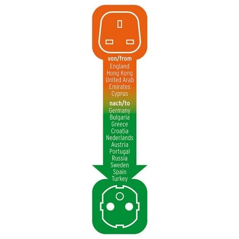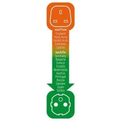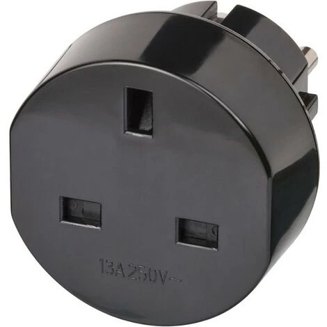 Adapter enabling electrical equipment using the British plug system to be used in countries using an earthed socket system, e.g. DE, FR, BE, PL, NL, ES, PT, SE, FI, NO, GR, TR, AT …